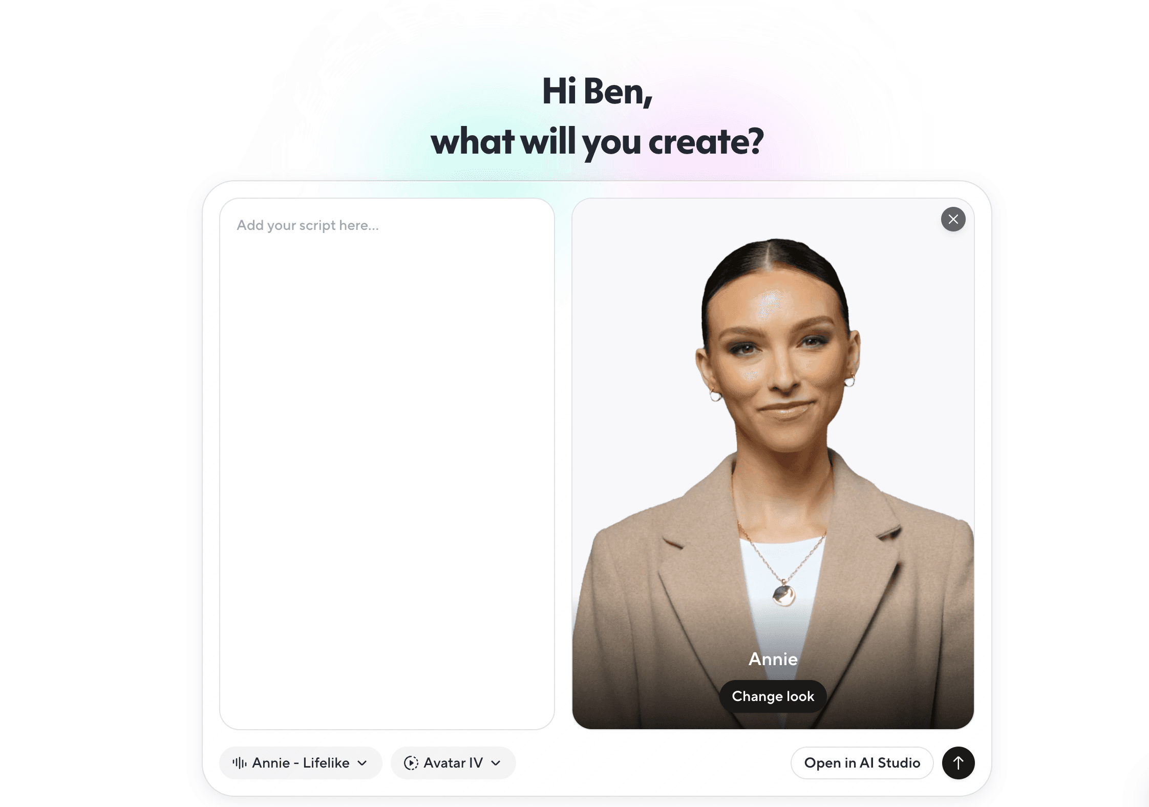 HeyGen follows a different workflow, despite a similar UI. You begin by selecting the type of asset you want to create (Talking Actor, Video, or Image) and only then does the creation begin.